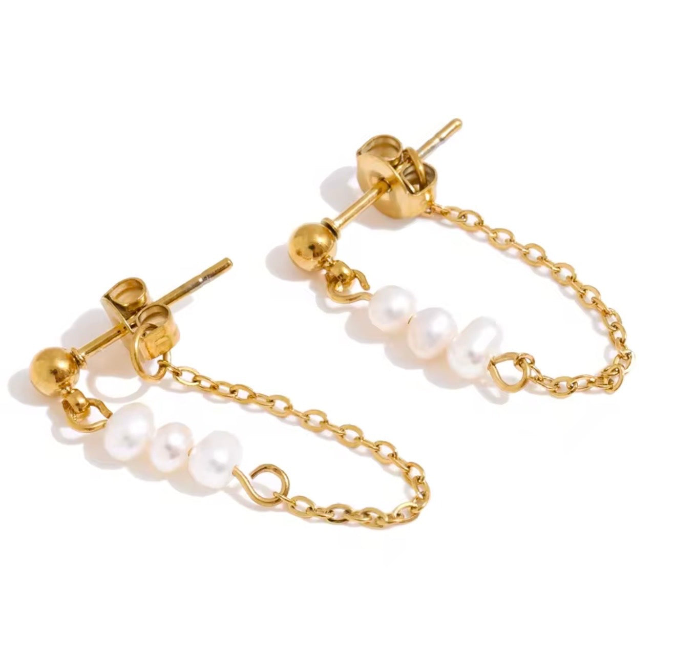 Elegant pearl and chain earrings crafted for everyday wear. These waterproof beauties feature genuine pearls paired with delicate chain details, making them perfect for layering or wearing solo. Durable enough for daily adventures, yet refined enough for any occasion. A timeless addition to your jewelry collection.